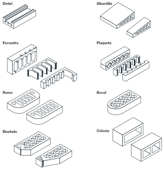 Con finalidades diversas, tales como formar parte de un arco, realizar ménsulas, rematar cornisas, rematar muros, encuentros en esquina, cambios en la dirección de ángulos, cambios de espesor, redondear esquinas, etc., existe una gran variedad de piezas especiales de ladrillo cara vista obtenidas por moldeo mediante boquillas o moldes especiales.
